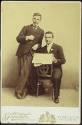 Photo in a studio of Constantine Caratheodory backwards on a chair holding a newspaper and of a man standing at his side.